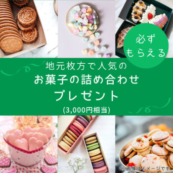 ご予約の上、初めてご来場いただいたお客様には枚方で人気のお菓子の詰め合わせ3000円分プレゼント!