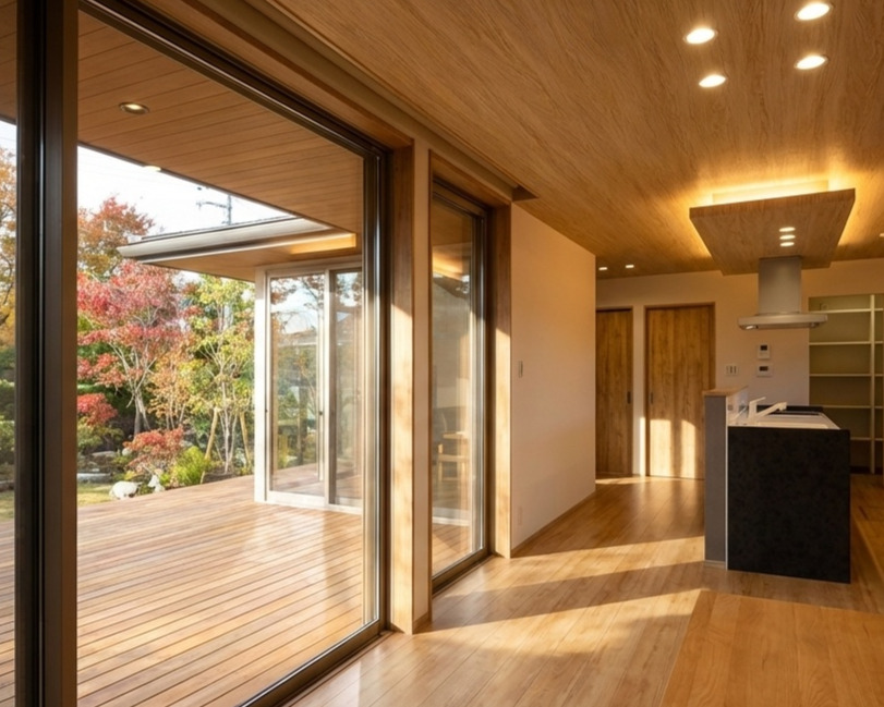 LDK(22帖)と和室(4.5帖)を開け放てば、26.5帖もの大空間が出現。さらにリビングの掃き出し窓からは、フラットにつながる「ウッドデッキ」と「中庭」へと視線が抜けます。道路からの視線を気にせず、愛犬と日向ぼっこをしたり、お子さん・お孫さんとプール遊びをしたり。高い耐震性を確保しながらこれだけの開放感を作れるのは、構造計算をしっかり行う田原建設ならではの設計力です。