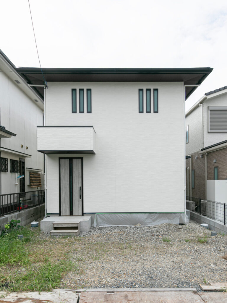 外観外構前の写真。シンプルスタイリッシュに、プライバシー考慮し大きな窓は道路側と反対に設置。