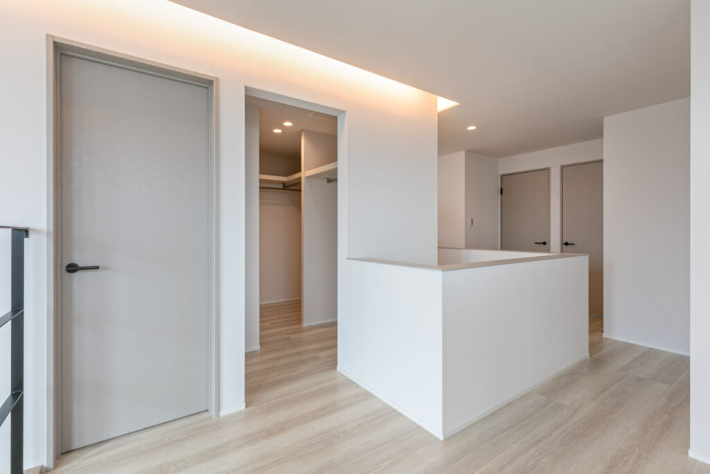 ファミリークローゼット1階と2階に配置。1階では洗濯動線に直結し、家族全員の衣類を一箇所に集約。