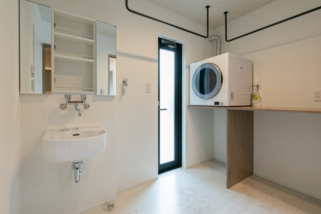 このお家では、脱衣所とファミリークローゼットを直結。洗濯機のすぐそばにガス乾燥機「乾太くん」とアイロンがけ用カウンターを完備し、洗う→乾かす→たたむ→しまうが、わずか数歩で完結します。
