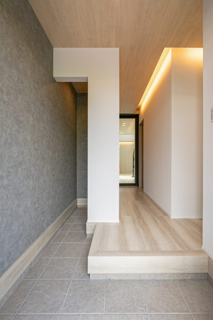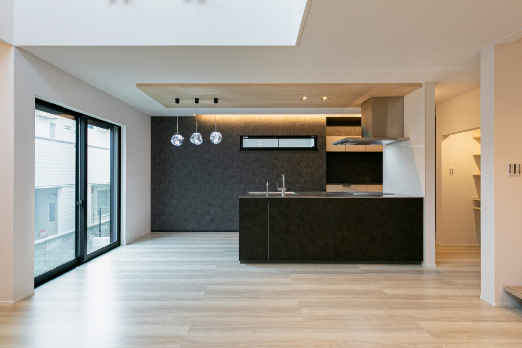アイランドキッチン料理をしながらリビングの家族と会話が弾む設計。ダークトーンのキッチン扉と木目の天井、グレーのアクセントウォールが織りなすモダンな空間は、まるでホテルライクな佇まいです。